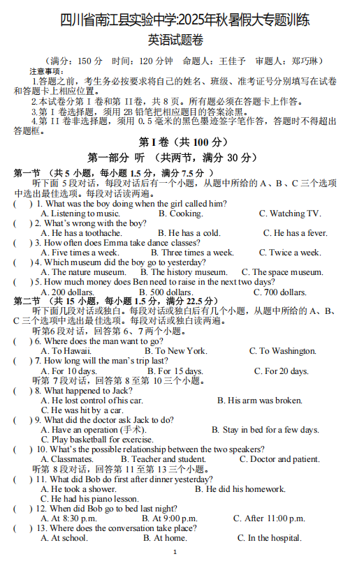 四川省巴中市南江县实验中学2025-2026学年上学期九年级入学考试英语试题