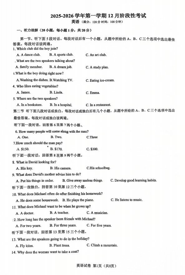 河南省许昌市建安区第三高级中学2025-2026学年七年级上学期12月月考英语试题