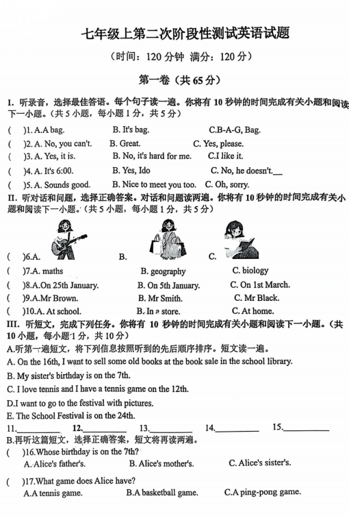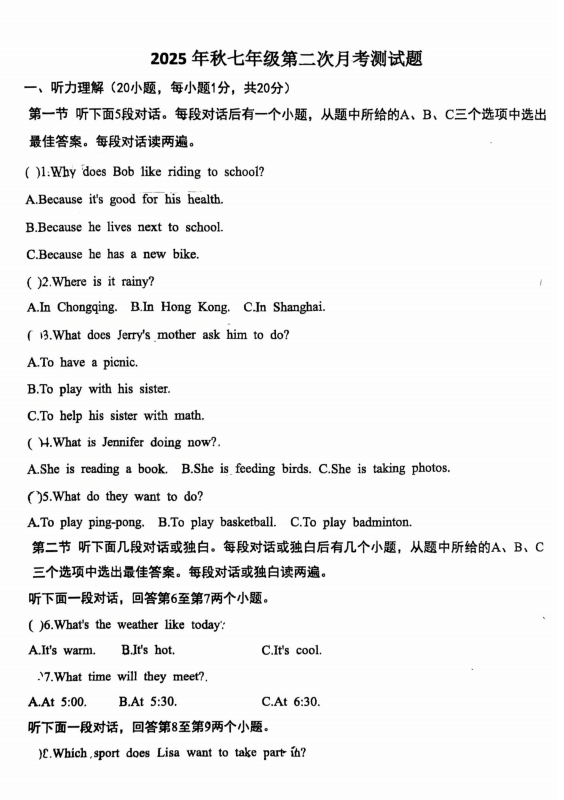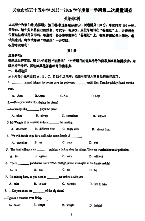 天津市第五十五中学2025-2026学年上学期七年级第二次月考英语试卷