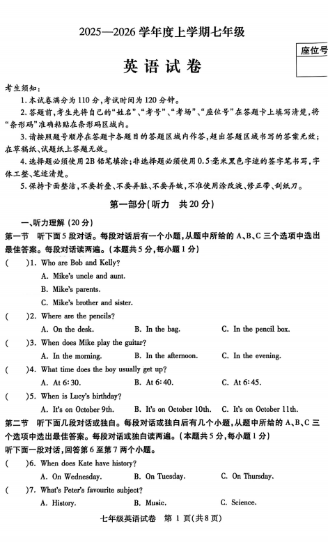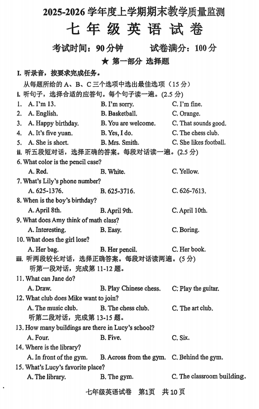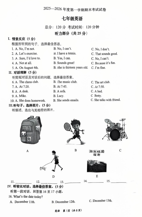 辽宁省铁岭市2025-2026学年七年级上学期1月期末英语试题