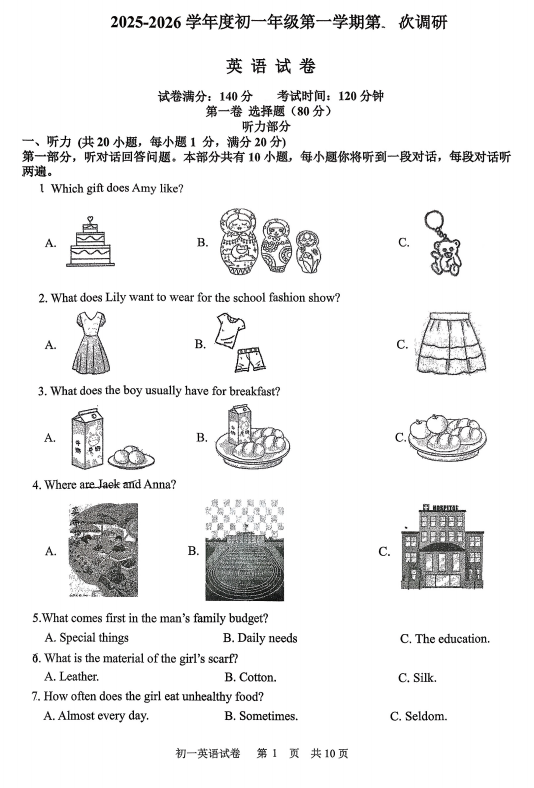 黑龙江省哈尔滨市南岗区2025-2026学年七年级上学期期末考试英语试卷