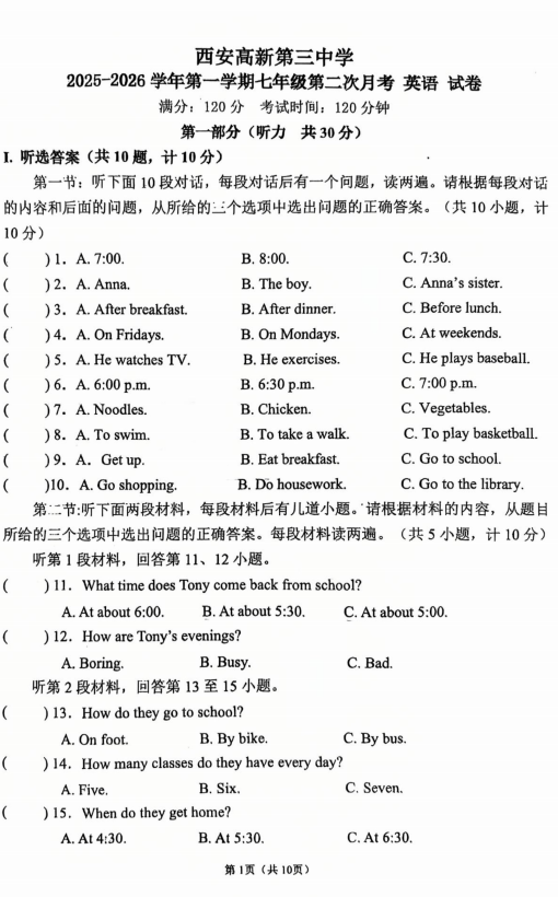 陕西省西安市高新区高新三中2025-2026学年七年级上册第二英语月考试卷