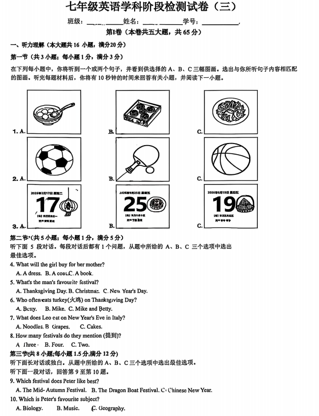 天津市滨海新区实验中学2025-2026学年七年级上学期第三次月考英语试题