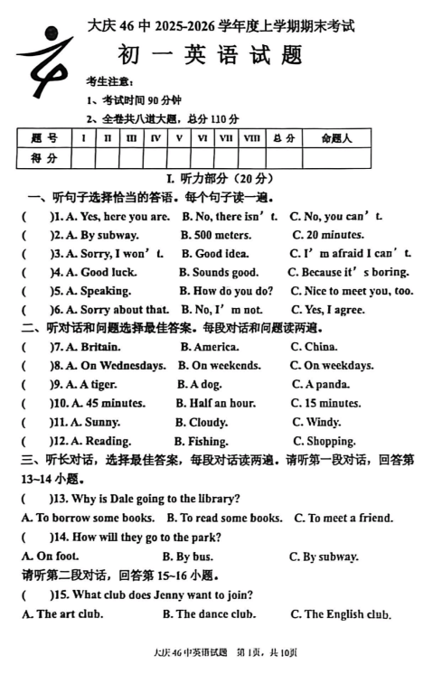 黑龙江省大庆市第四十六中学2025-2026学年七年级上学期期末英语试卷