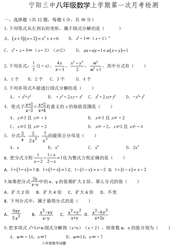 山东省泰安市宁阳县第三中学(五四制)2025-2026学年八年级上学期第一次月考数学试题