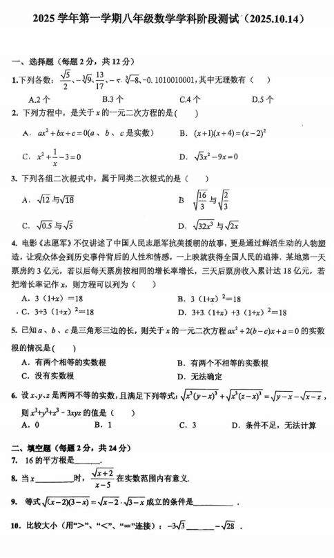 上海市长宁区复旦中学2025-2026学年上学期10月月考八年级数学试题