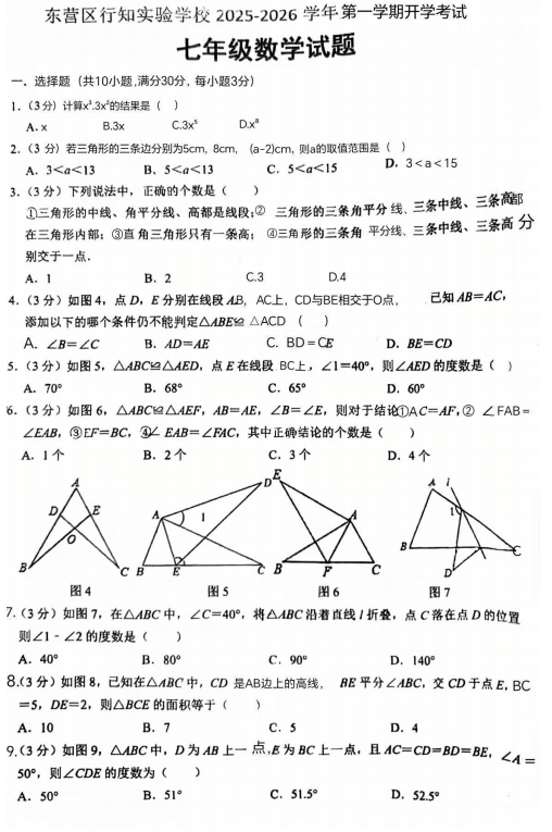 山东省东营市东营区行知实验学校2025-2026学年七年级上学期开学考试数学试题