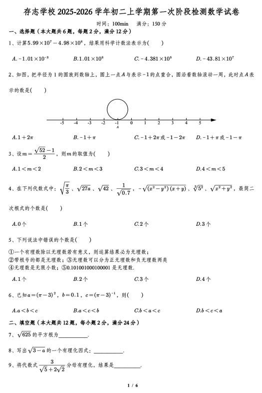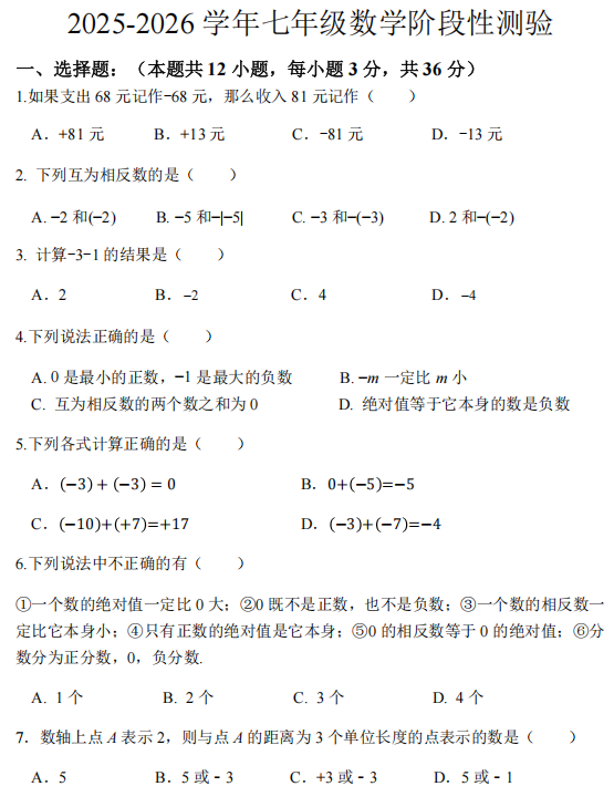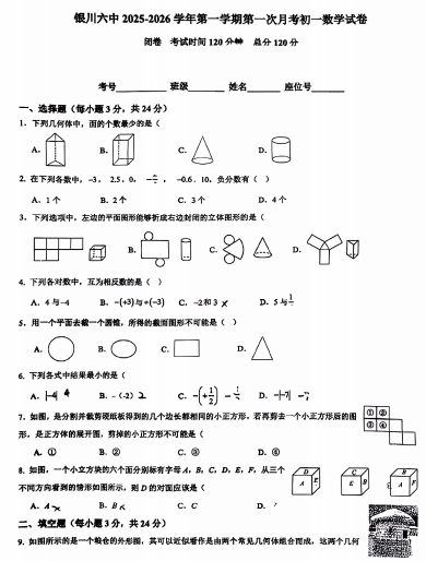 宁夏回族自治区银川市六中2025-2026学年上学期第一次月考七年级数学试卷