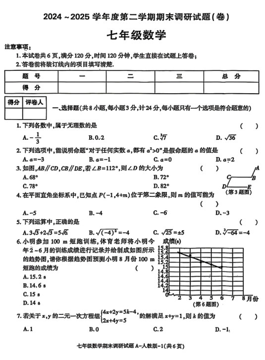 河北省邯郸市武安市团城中学2024—2025学年下学期七年级数学期末调研试题