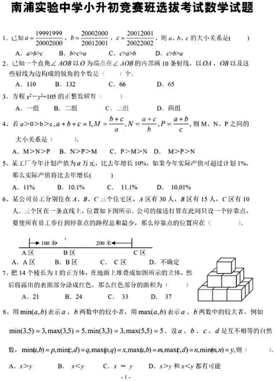 浙江省温州市南浦实验中学2025-2026学年上学期小升初竞赛班选拔考试数学试题