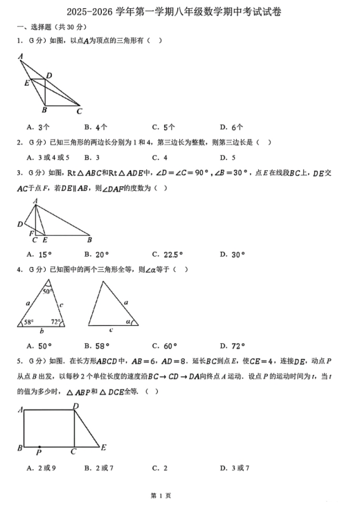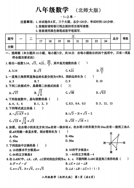 江苏省南京师范大学附属中学树人学校2025-2026学年八年级第一学期数学第一次月考