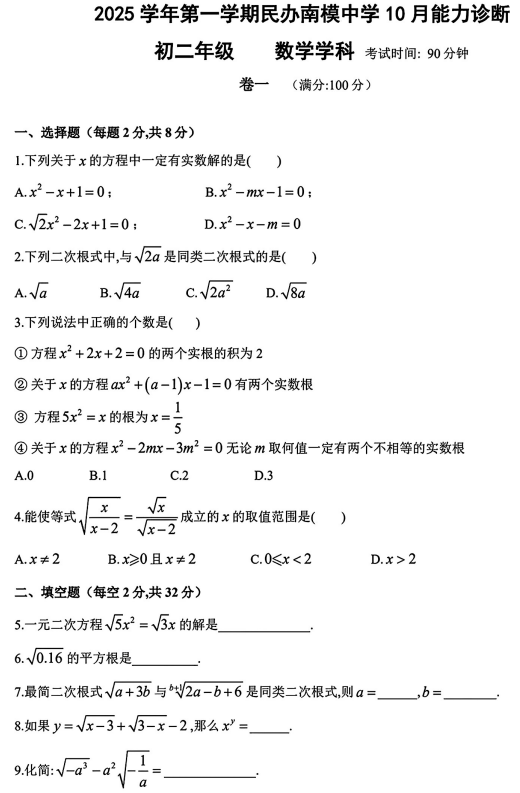上海民办南模中学2025-2026学年上学期八年级数学学科10月月考试卷
