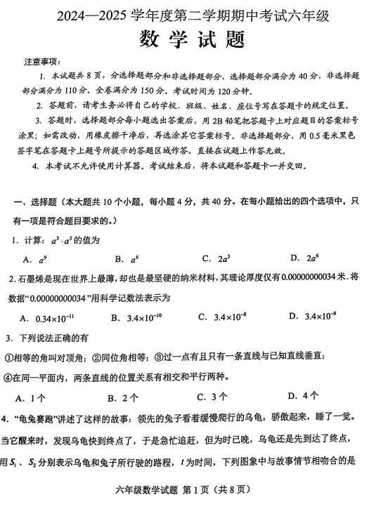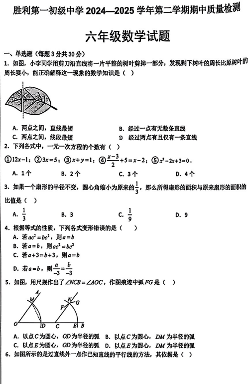 山东省东营市胜利第一初级中学2024-2025学年六年级下数学期中试卷