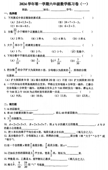 上海宝山区+2024-2025学年上学期六年级9月月考数学试题(五四制)