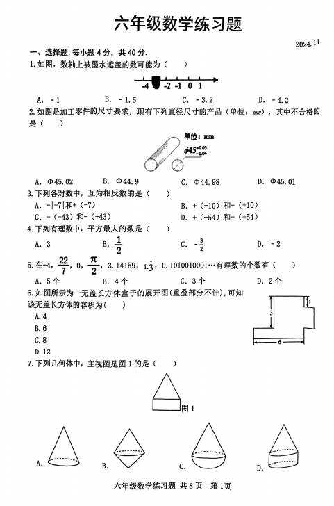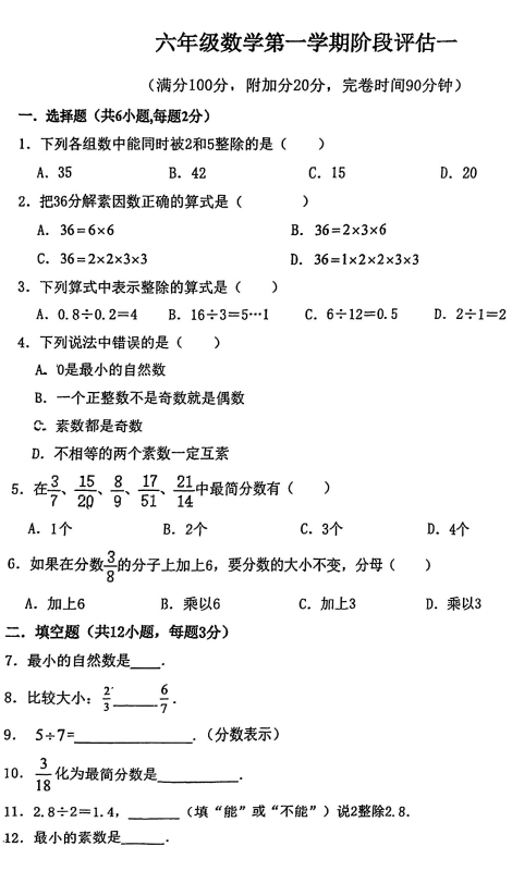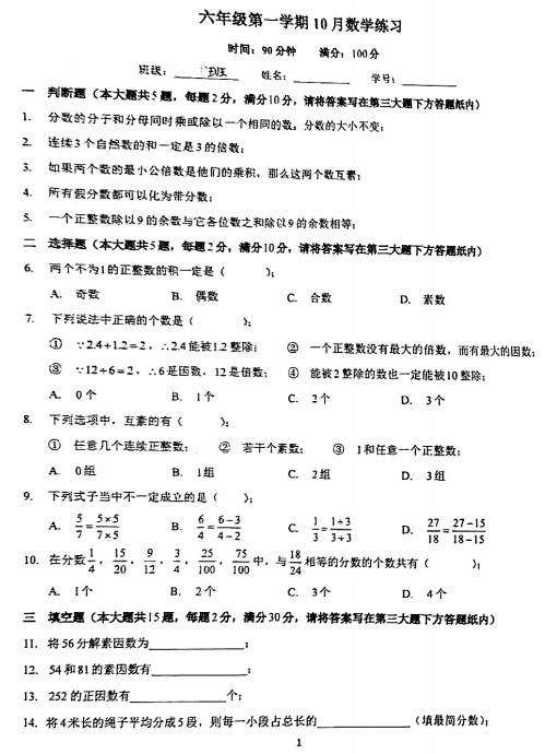 上海市建平中学西校+2024-2025学年六年级上学期第一次月考数学试题(五四制)