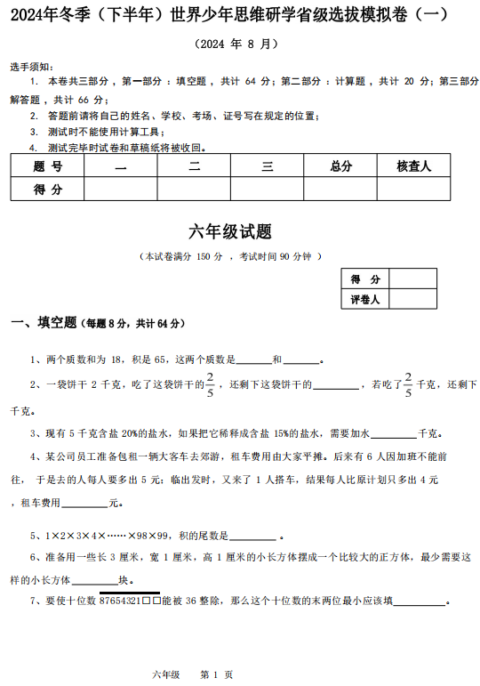 上海市+2024-2025学年六年级上学期8月世少赛模拟卷(一)数学试卷(五四制)