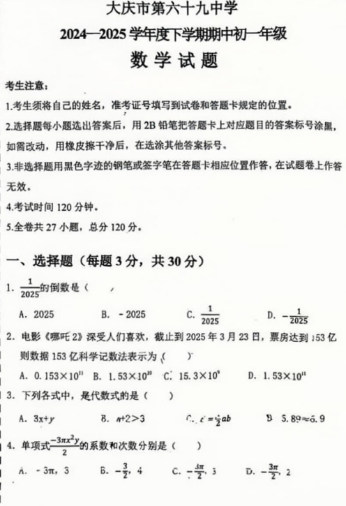 黑龙江省大庆市第六十九中学2024--2025学年下学期六年级(五四制)期中数学试题