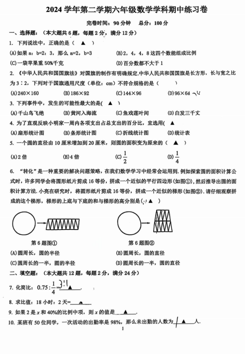 上海市奉贤区2024-2025学年六年级下册期中数学试题