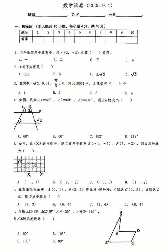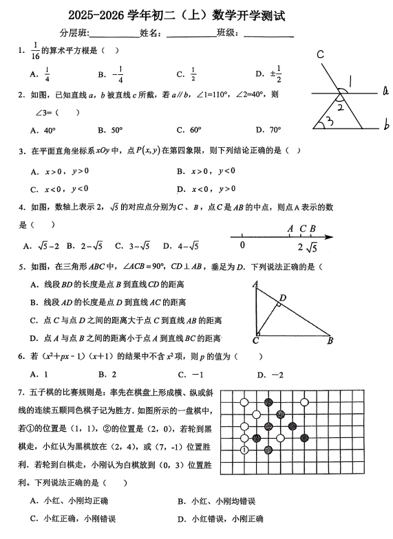 北京市第四中学2025-2026学年上学期八年级数学开学考试卷
