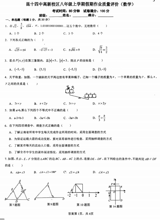 云南省昆明市第十四中学高新校区2025-2026学年上学期八年级开学考试数学试题