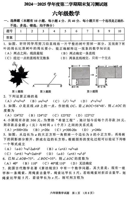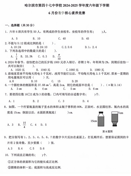 黑龙江省哈尔滨市第四十七中学2024-2025学年(五四制)六年级下学期6月份月考数学试题