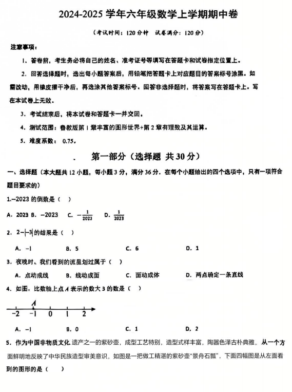 山东省东营市文苑学校2024-2025学年上学期六年级数学期中试卷