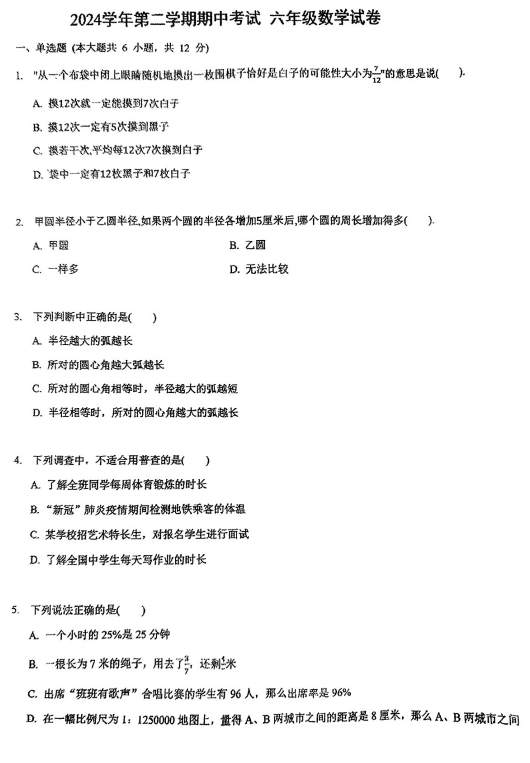 上海民办至德实验学校2024-2025学年六年级下学期期中数学试题(五四制)