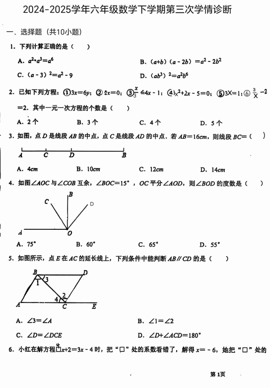 山东省东营市东营区第一中学2024-2025学年下学期六年级数学第三次月考试卷
