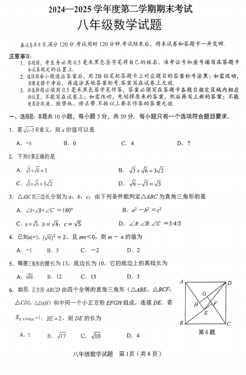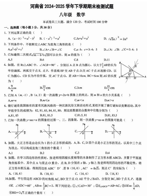 河南省许昌市建安区第三高级中学2024-2025学年下学期期末考试八年级数学