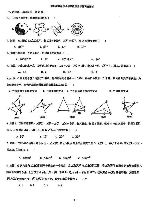 江苏省徐州市树德中学2024-2025学年八年级上学期第一次月考数学卷