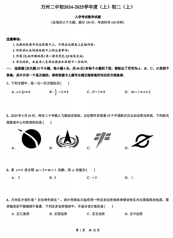 重庆市万州第二高级中学2024-2025学年八年级上学期开学考数学试卷