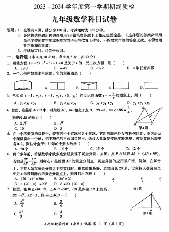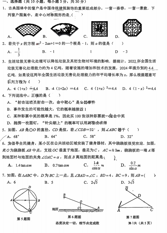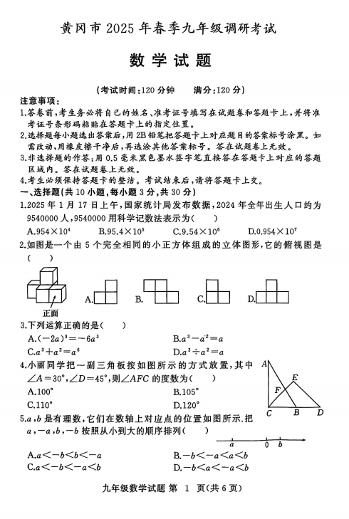 湖北省黄冈市2024-2025学年下学期期末考试九年级数学试题