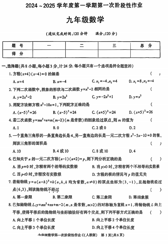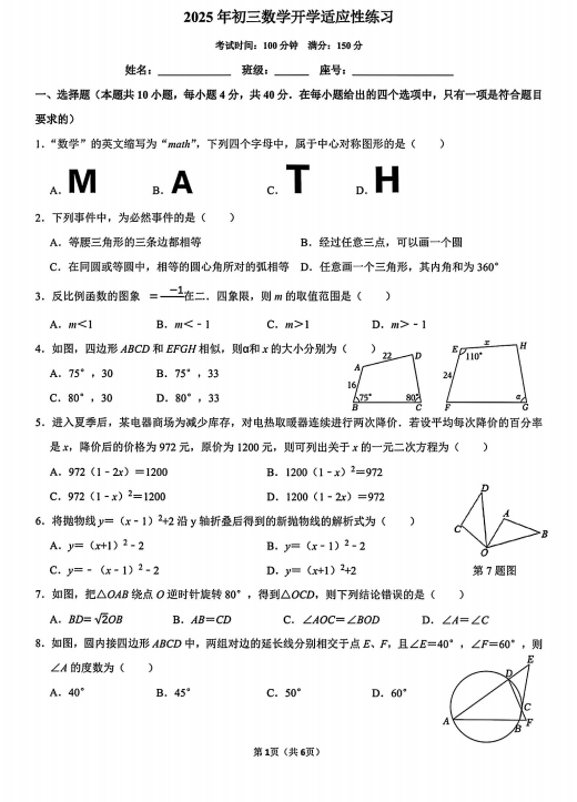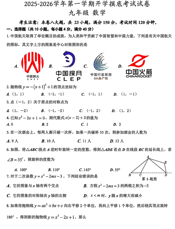 山西省平遥县古陶镇第一初级中学2025-2026学年上学期开学摸底考试九年级数学试卷