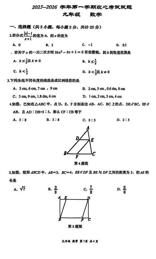 陕西省西安市雁塔区高新一中2025--2026学年上学期收心考试试题九年级数学