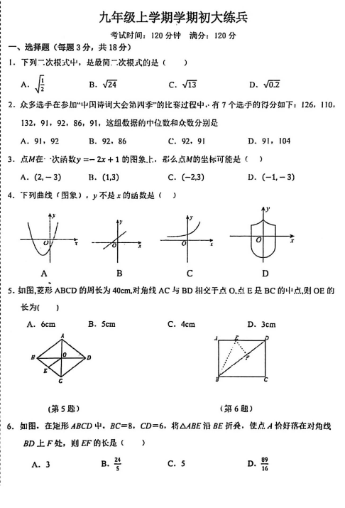 广西柳州市文华中学教育集团2024-2025学年九年级数学上学期开学考试卷