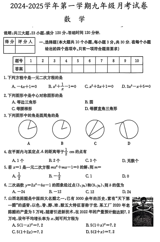 山西省吕梁市文水县2024-2025学年上学期九年级月考数学试卷
