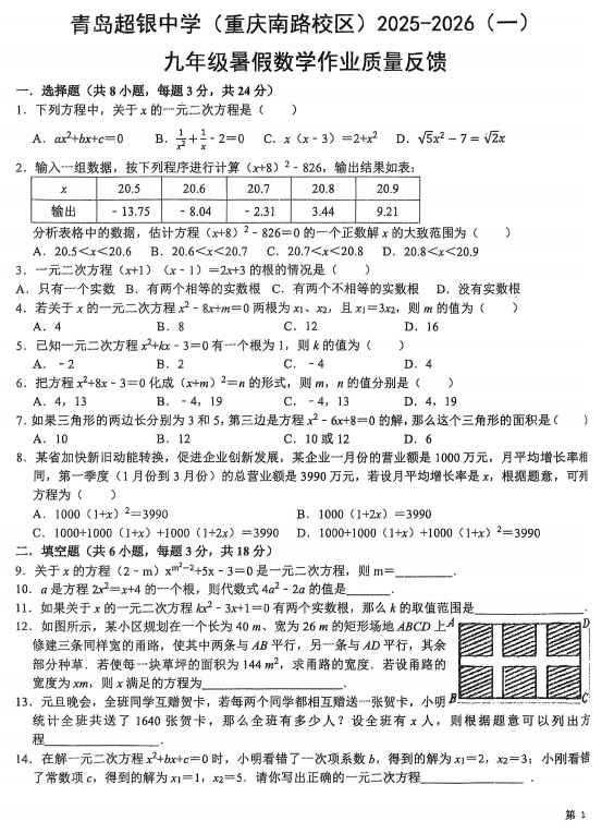 山东省青岛市市南区青岛超银中学2025-2026学年九年级上学期开学数学试题
