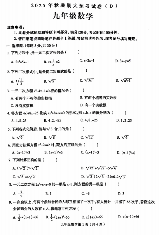 河南省周口市郸城县实验中学2025-2026学年九年级上学期开学数学试题