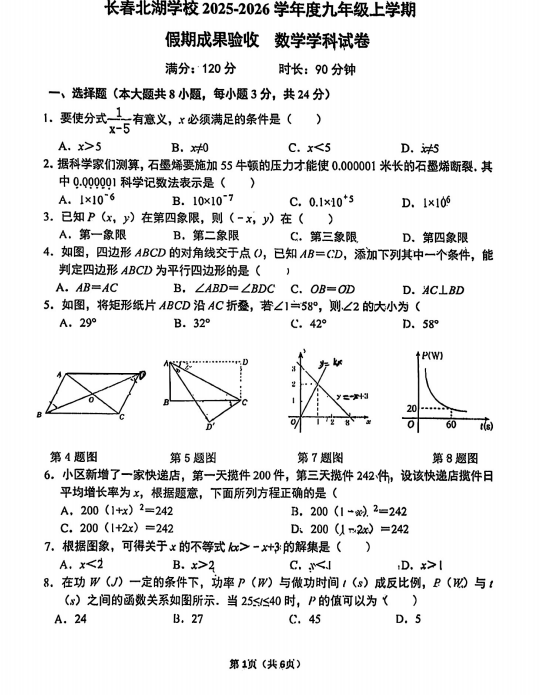 吉林省长春市北湖学校2025-2026学年上学期九年级开学考数学试卷