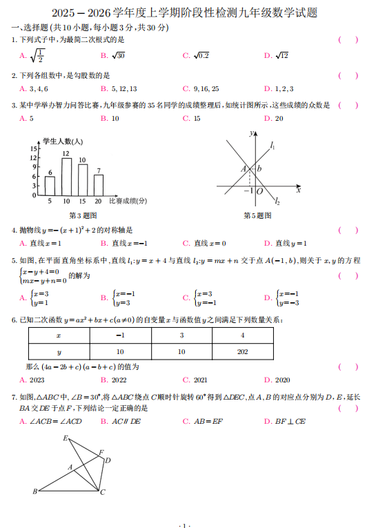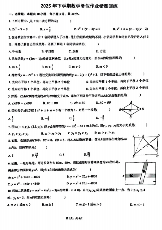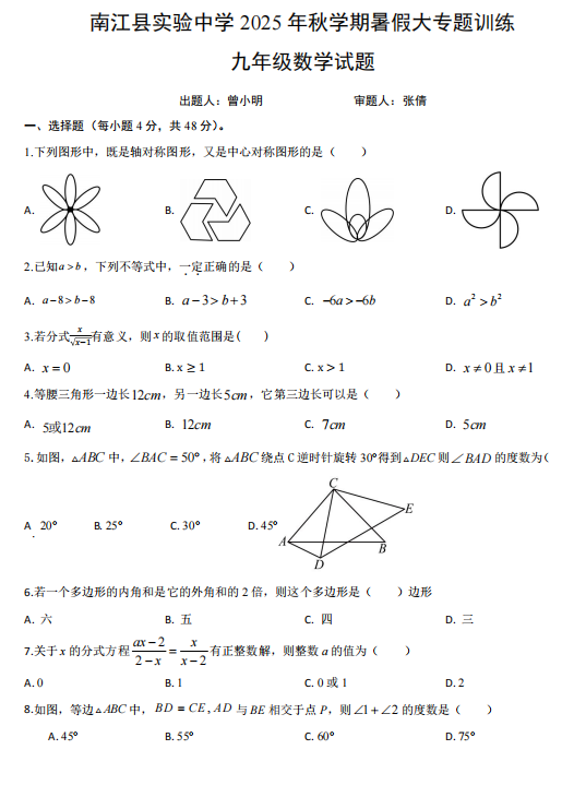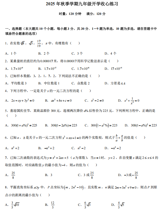 四川省巴中市南江县实验中学2025-2026学年九年级上学期入学考试数学试题