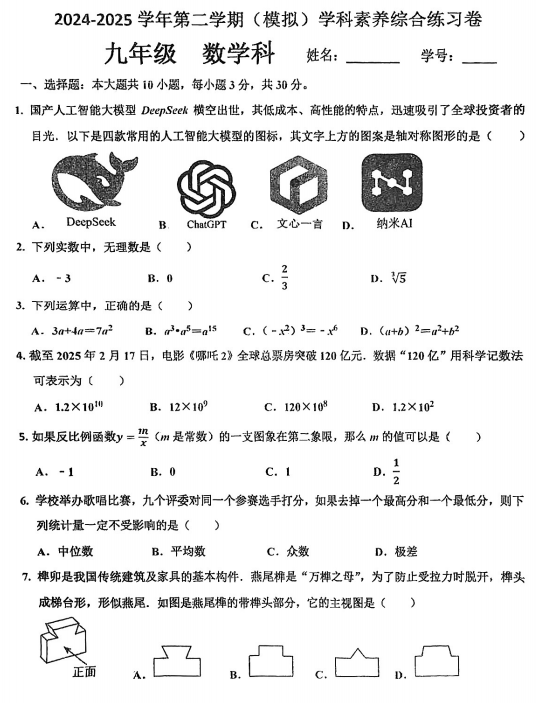 广东省江门市杜阮镇杜阮中心初级中学2024-2025学年九年级下学期第二次模拟考试数学试题