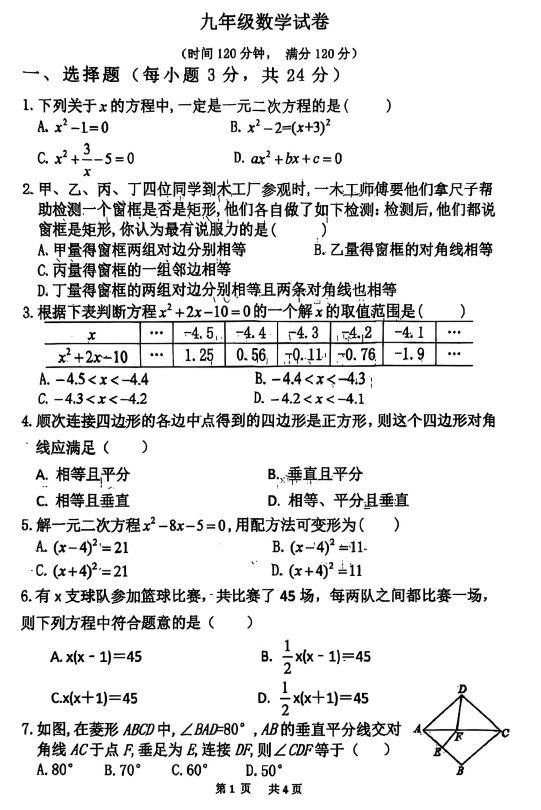 广西南宁市凤岭南中学2025--2026学年九年级上学期开学考试数学试卷