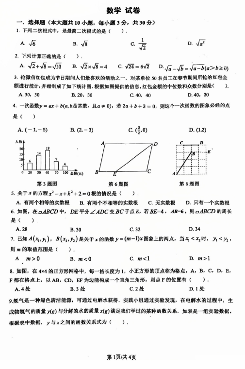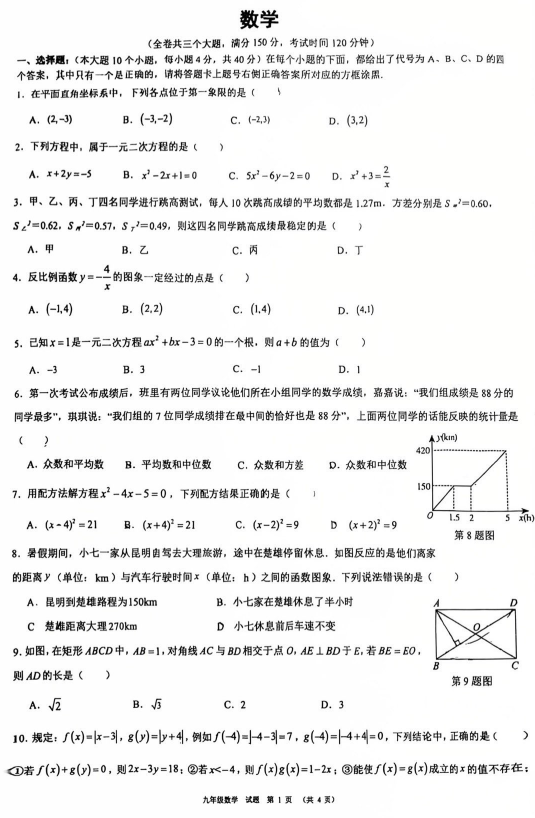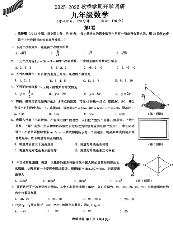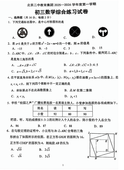 北京市第二中学分校2025-2026学年九年级上学期数学开学考试卷