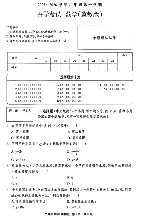 河北省衡水市桃城区衡水市小候中学2025-2026学年九年级上学期开学数学试题