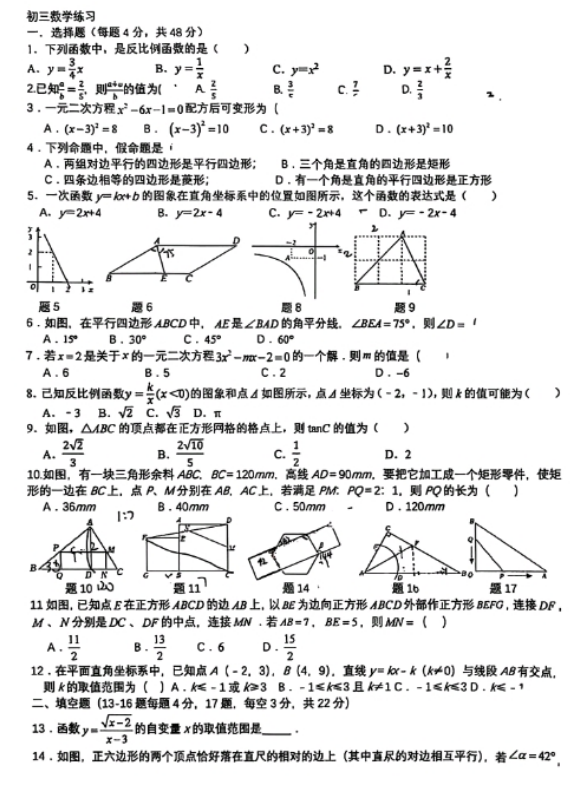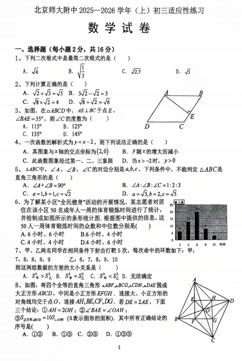 北京师范大学附属中学2025-2026学年九年级上学期开学考试数学试卷