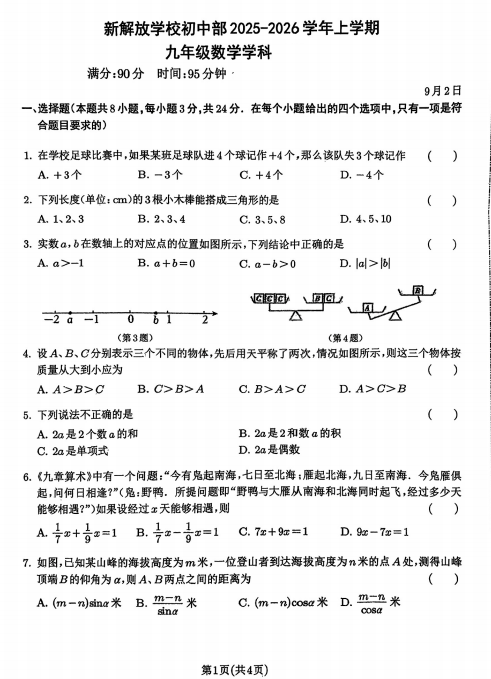 吉林省长春市新解放学校初中部2025-2026学年上学期九年级开学考数学试卷