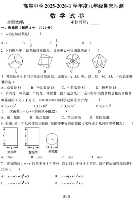 宁夏中卫市海原县高崖乡九年一贯制学校2025-2026学年上学期期末考试九年级数学试卷