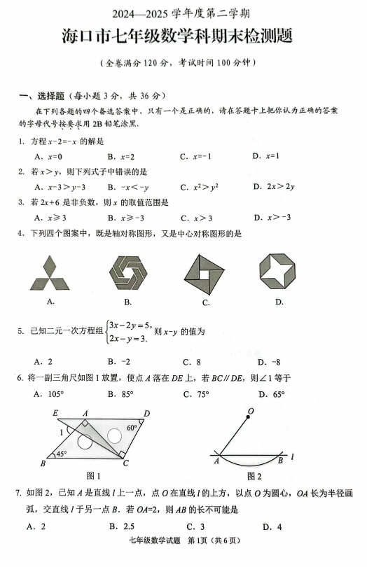 海南省海口市2024-2025学年七年级下学期6月期末数学试题