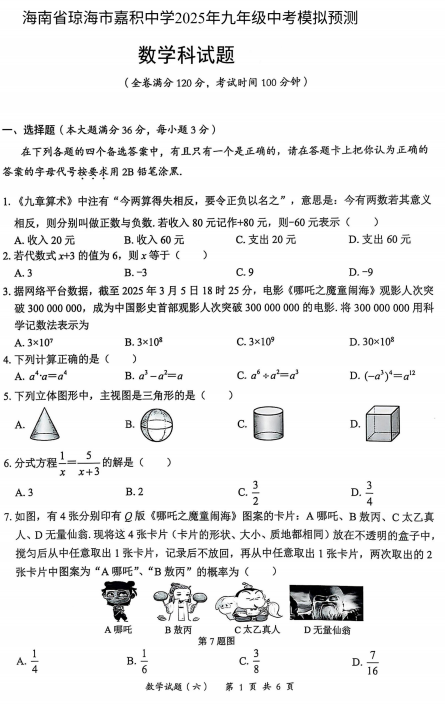 海南省琼海市嘉积中学2025年九年级中考模拟预测数学试题+