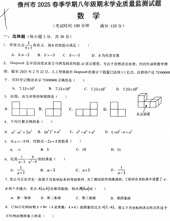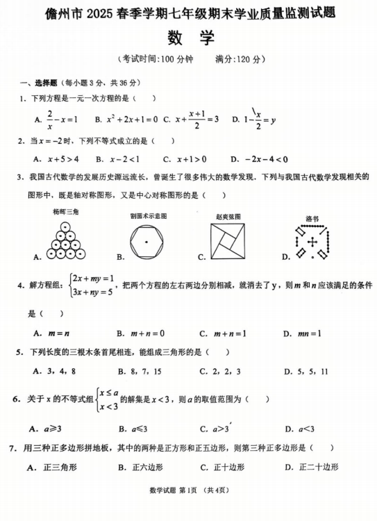 海南省儋州市2024—2025学年下学期七年级期末学业质量监测测数学试题